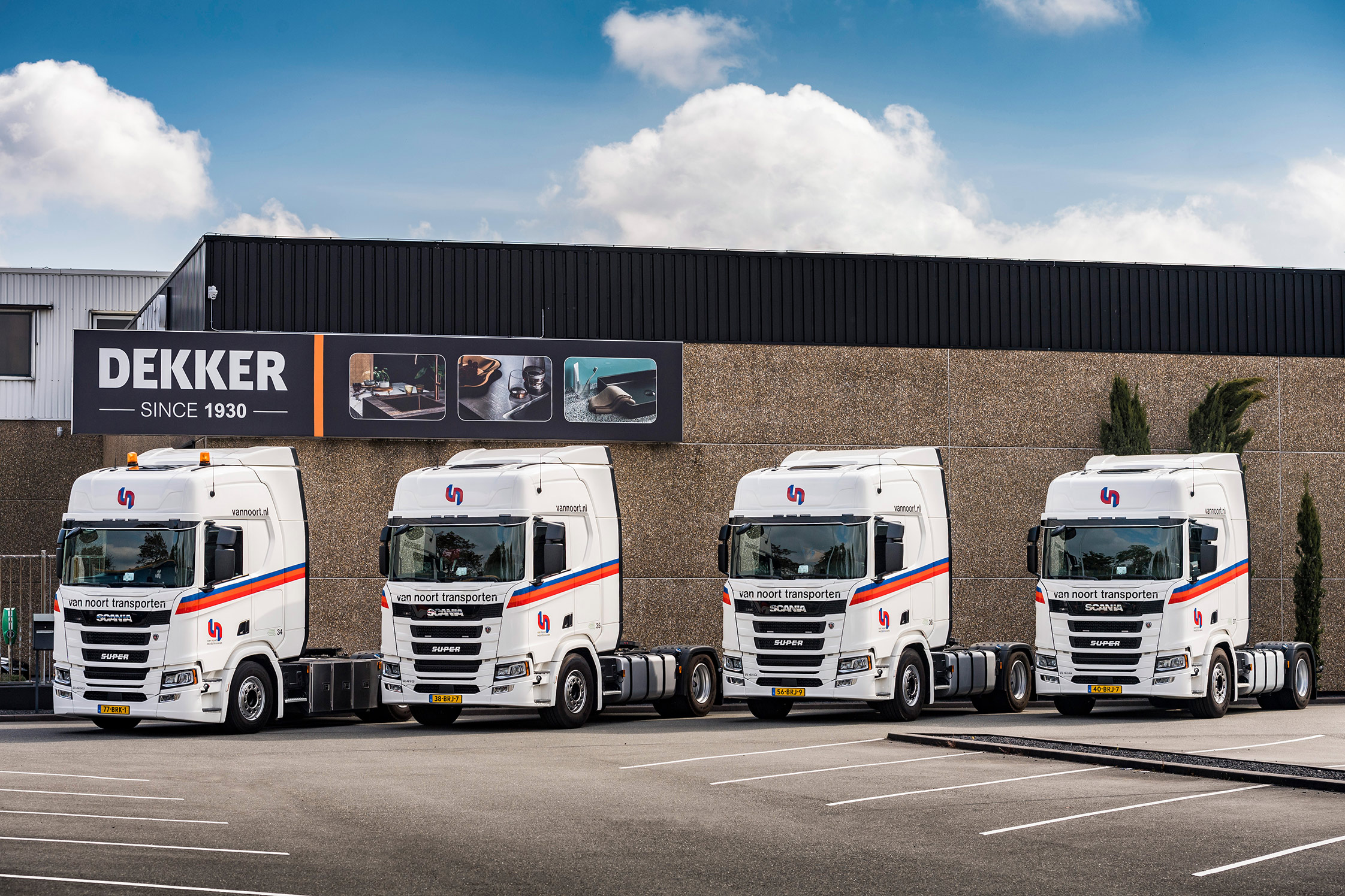 Drie trekkers worden ingezet voor opdrachtgever Dekker Zevenhuizen B.V.; leverancier van keukenbladen, spoelbakken, kranen en aanverwante producten voor de keuken en badkamer. Deze producten worden dagelijks door de gehele Benelux uitgeleverd. Vanaf 1 mei jl. zet Van Noort dagelijks 5 trekkers in voor het transport van deze producten. Deze voertuigen maken voor Van Noort begrippen veel kilometers; zo’n 85.000 per jaar. Omdat ze niet op de standplaats in Waddinxveen parkeren is er gekozen voor een extra brandstoftank. Dat maakt het mogelijk om één keer in de week te tanken.