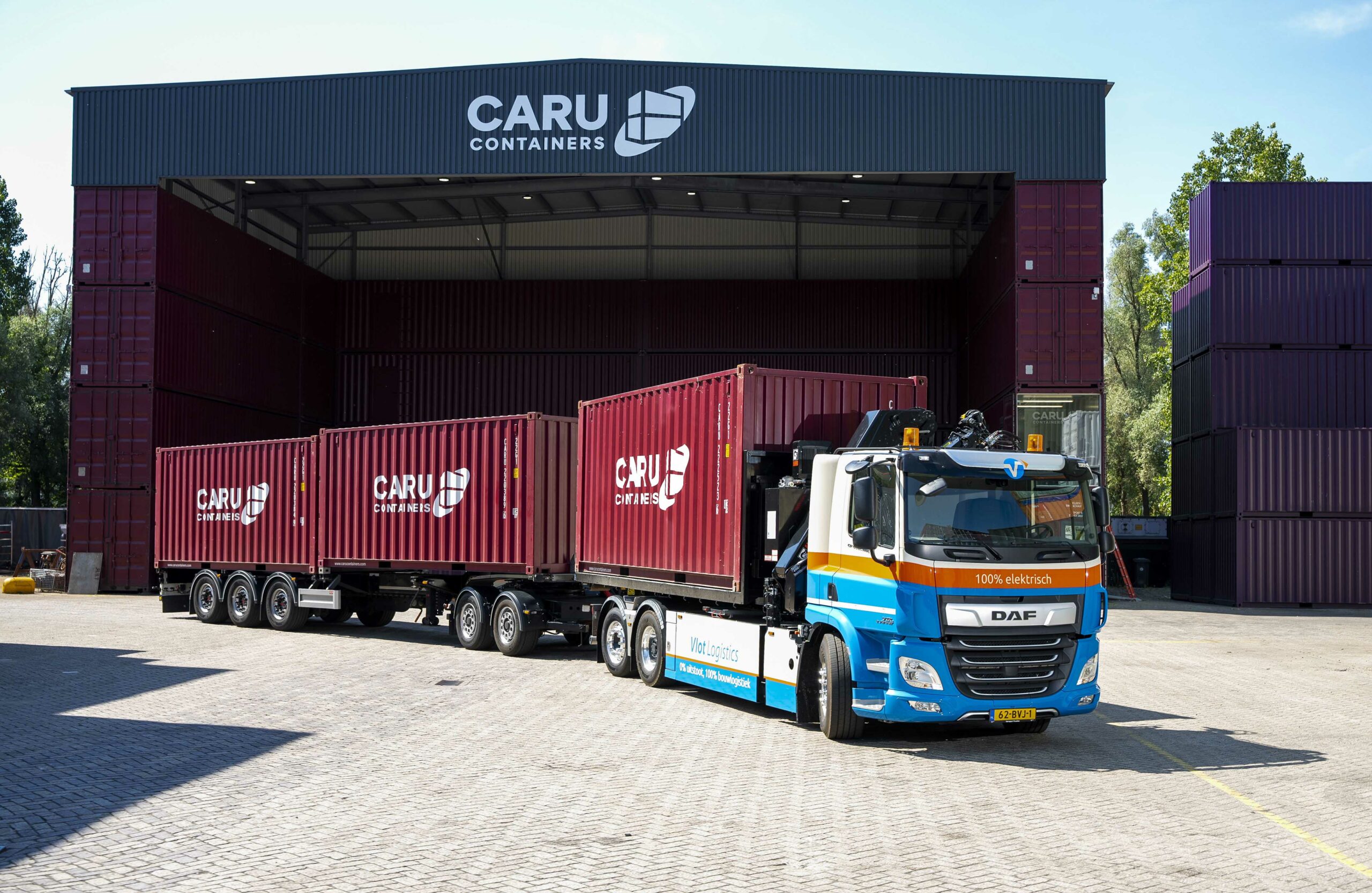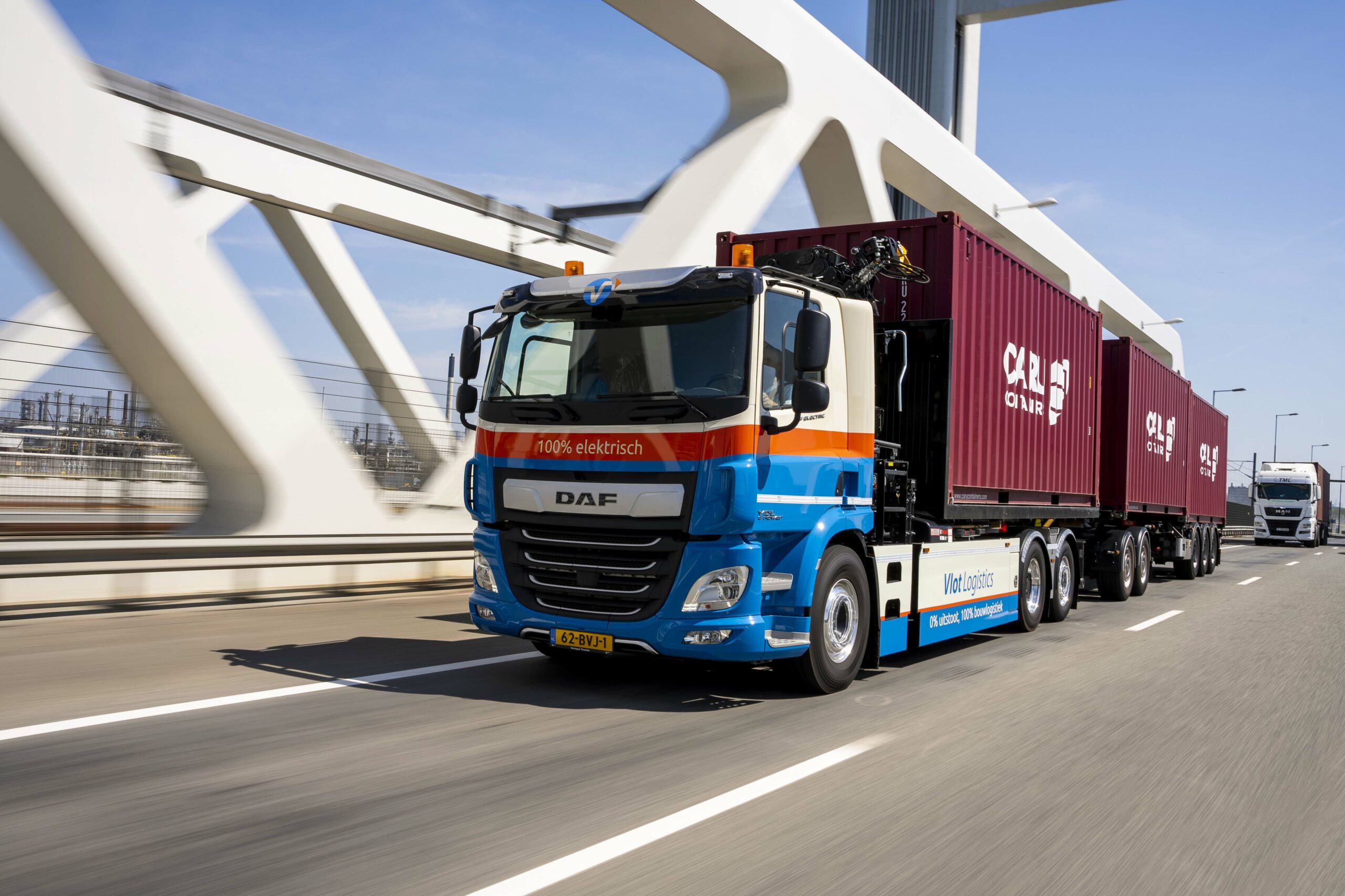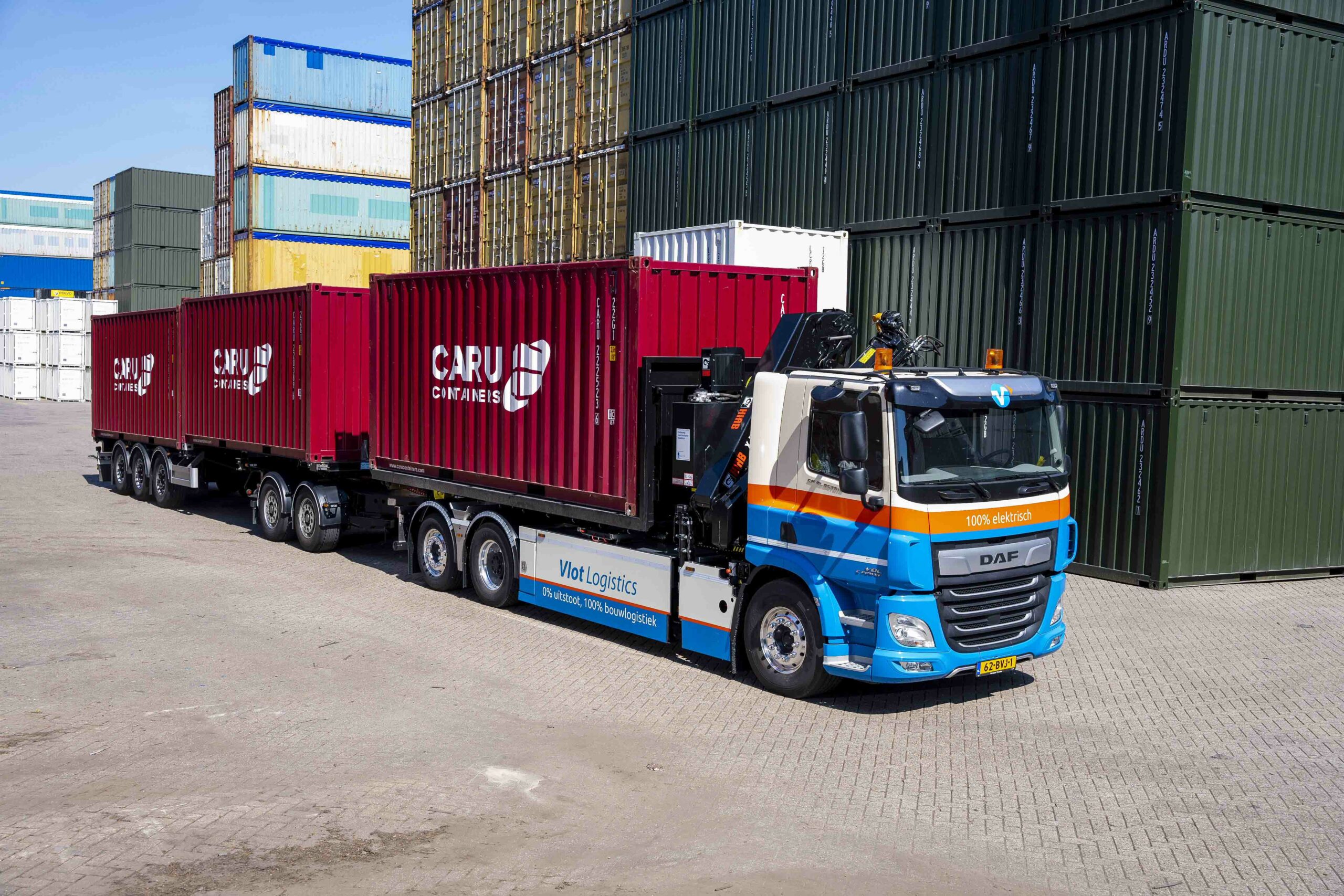Vlot Logistics en DAF hebben de primeur! De DAF CF Electric staat voor de eerste volledig elektrische LZV-combinatie in Nederland. Het Sliedrechtse bedrijf Vlot Logistics heeft deze bijzondere truck onlangs in gebruik genomen. De combinatie is voorzien van een HIAB-haakarm in combinatie met een 23 tonmeter kraan en wordt onder meer ingezet voor het vervoer van containers.
